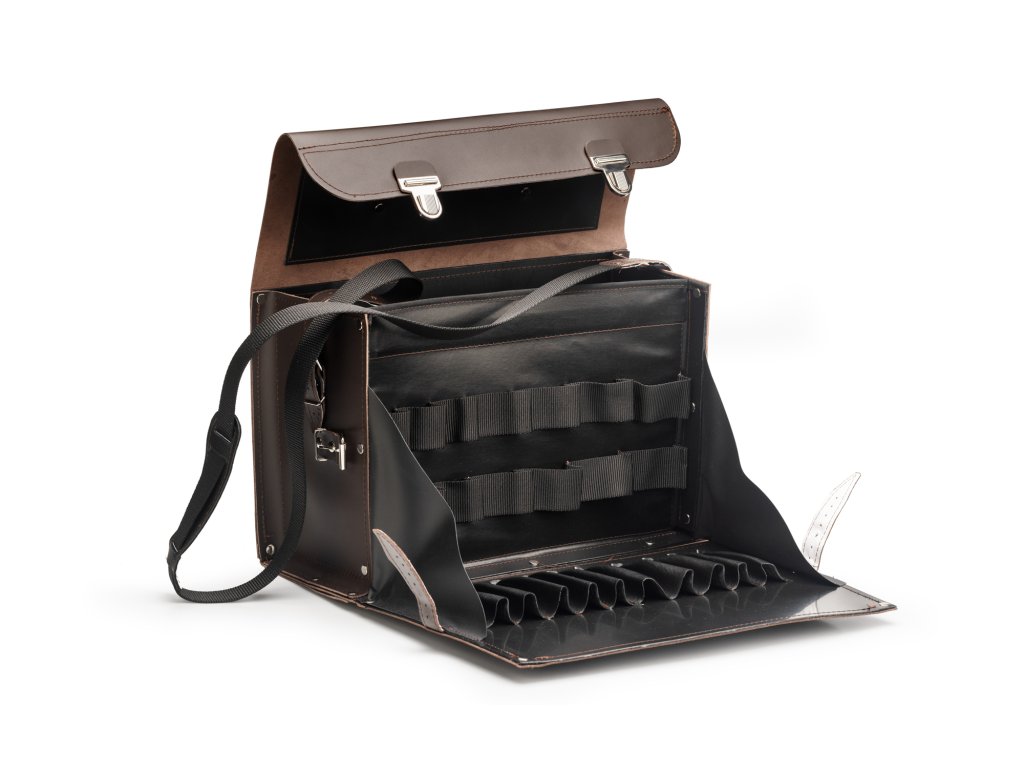 Profesionální brašna rozkládací. Nabízí maximální užitnost každého prostoru v ní. Brašna je z přírodní usně, je pevně vyztužená ze všech stran Jena řada kapes je přizpůsobena na velmi jemné nářadí. Obsahuje čtyři řady vnitřních kapes na nářadí a jednu prostornou přední kapsu. Možnost otevření předního dílu brašny pomocí přezek na bocích,(zajištění ocelovou přepážkou) nabízí přehlednou manipulaci s nářadím. Vhodná pro velké množství nářadí, na montážní práce a jiné. Uspokojí i nejnáročnějšího uživatele. Při zavřené poloze vypadá stejně jako brašna 202.
