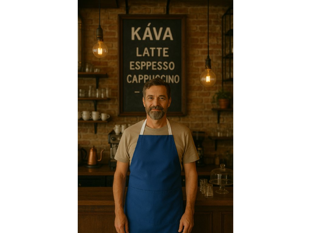 Skladem máme světle modrou. Na zástěry vám můžeme došít kapsy.